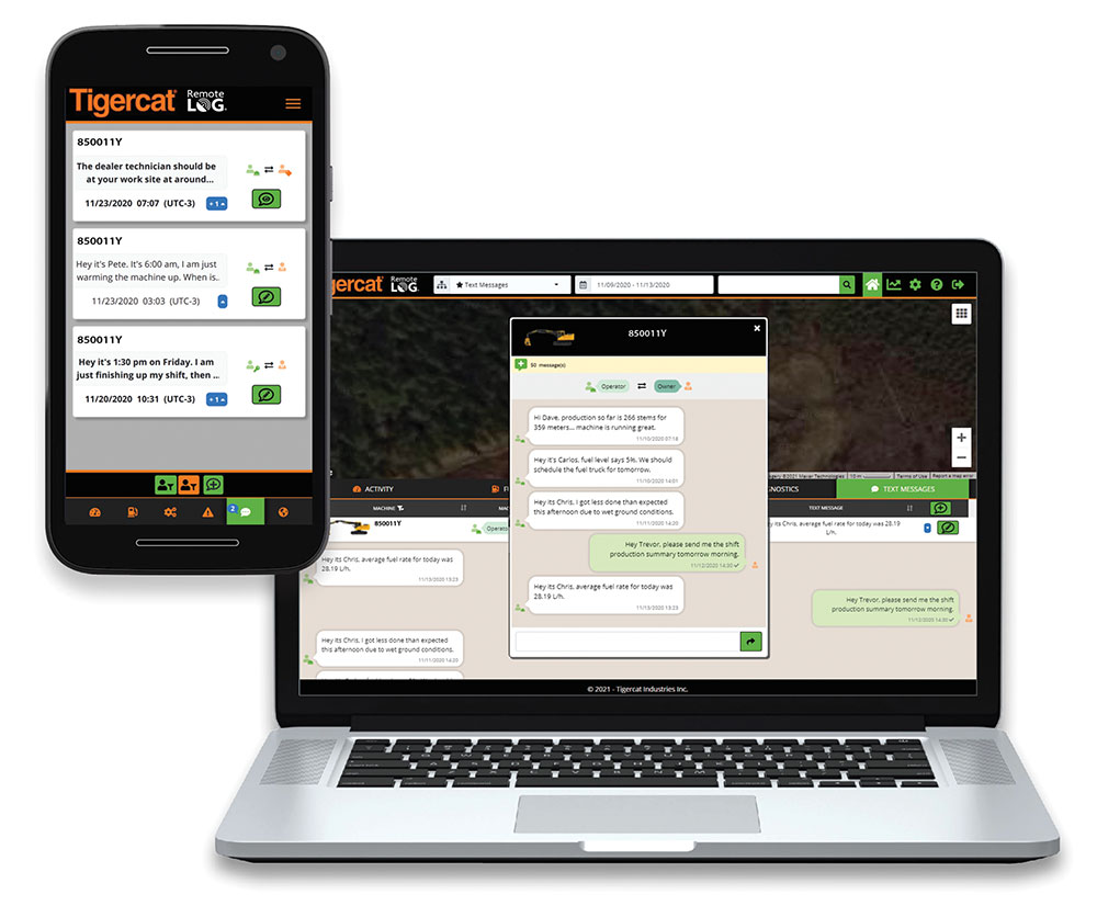 Tigercat offers new features on its powerful RemoteLog and LogOn telematics system. Using the same satellite connection as RemoteLog, machine operators or technicians may now send and receive simple text messages when no cellular mobile network is available. There is no need for another messaging service—RemoteLog does it all.