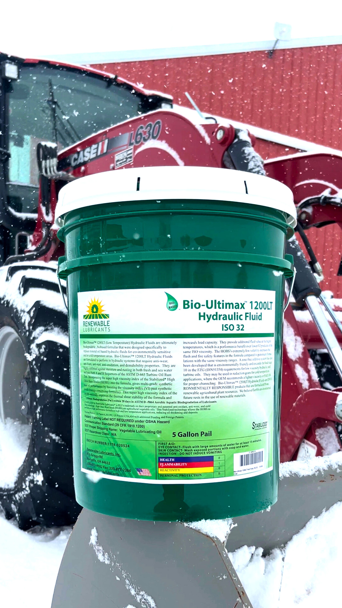 Bio-Ultimax 1200LT hydraulic fluids from Renewable Lubricants are environmentally friendly, biosynthetic formulas that provide outstanding reliability in low-temperature conditions. These ultimately biodegradable fluids help users avoid the nagging problems of winter, including slow startup, sluggish performance, seal leaks and moisture contamination. Bio-Ultimax 1200LT outperforms mineral oil-based options, maintaining cold temperature pumpability down to -40°F with a pour point as low as -76°F.. It gives exceptional oxidation resistance, anti-wear properties, and compatibility with high-pressure systems while offering users an environmentally responsible choice. Available in ISO grades 5, 10, 15, 22, 32, and 46, Bio-Ultimax 1200LT Hydraulic Fluids offer the flexibility to meet various viscosity requirements, including SAE 0W20 and 0W30 equivalents. It is ideal for use in snow grooming equipment, snow plows, construction equipment, waste management vehicles, industrial machinery, marine deck equipment used in frigid conditions, and other hydraulic systems operating in cold environments.